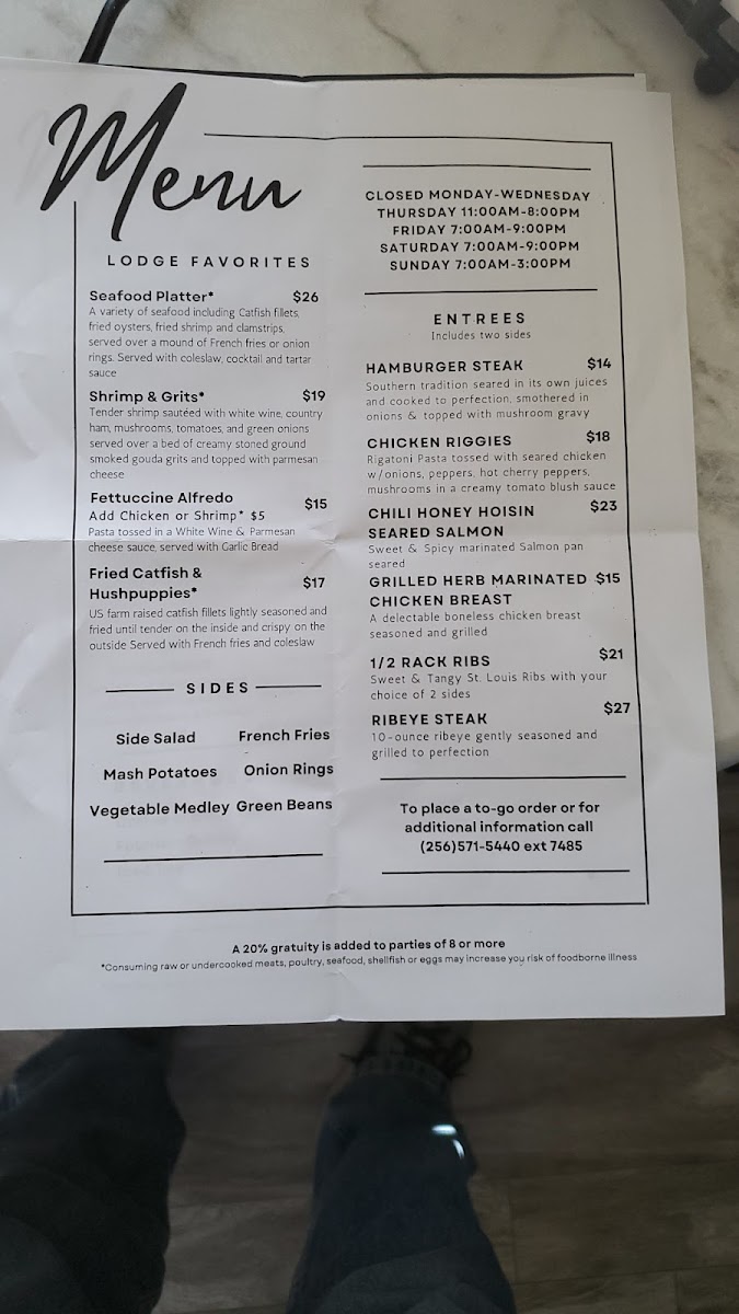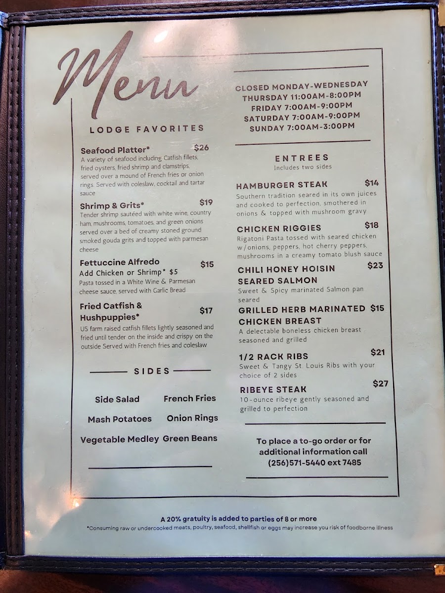 Welcome to Pinecrest Dining Room, nestled in the scenic backdrop of Guntersville, Alabama. This charming spot offers a menu that beautifully captures Southern comfort food with a gourmet twist. Start with their delectable Seafood Platter or the popular Fried Catfish & Hushpuppies, both crowd favorites among patrons. For sandwich lovers, the Lodge Burger and Reuben showcase the kitchen’s commitment to quality flavors.